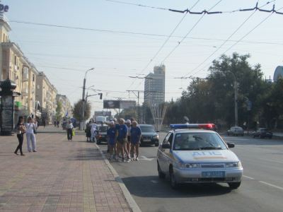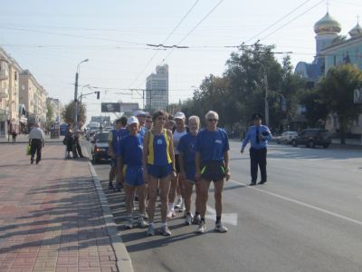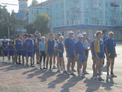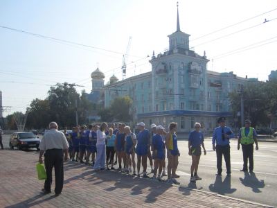 В центре города, на перекрестке у памятника Тарасу Шевченко, собрались представители клуба любителей бега «Олимп», которые вместе со студентами совершили организованный круговой пробег по центральным улицам Луганска.
