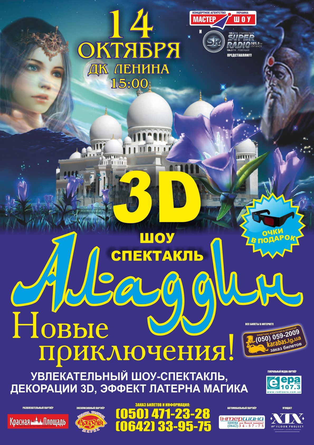 В Луганске 14 октября в 15.00 в ДК имени Ленина покажут уникальный 3D шоу-спектакль «Аладдин. Новые приключения». Об этом информагентству Cxid.info сообщили организаторы – концертное агентство «Мастер Шоу».