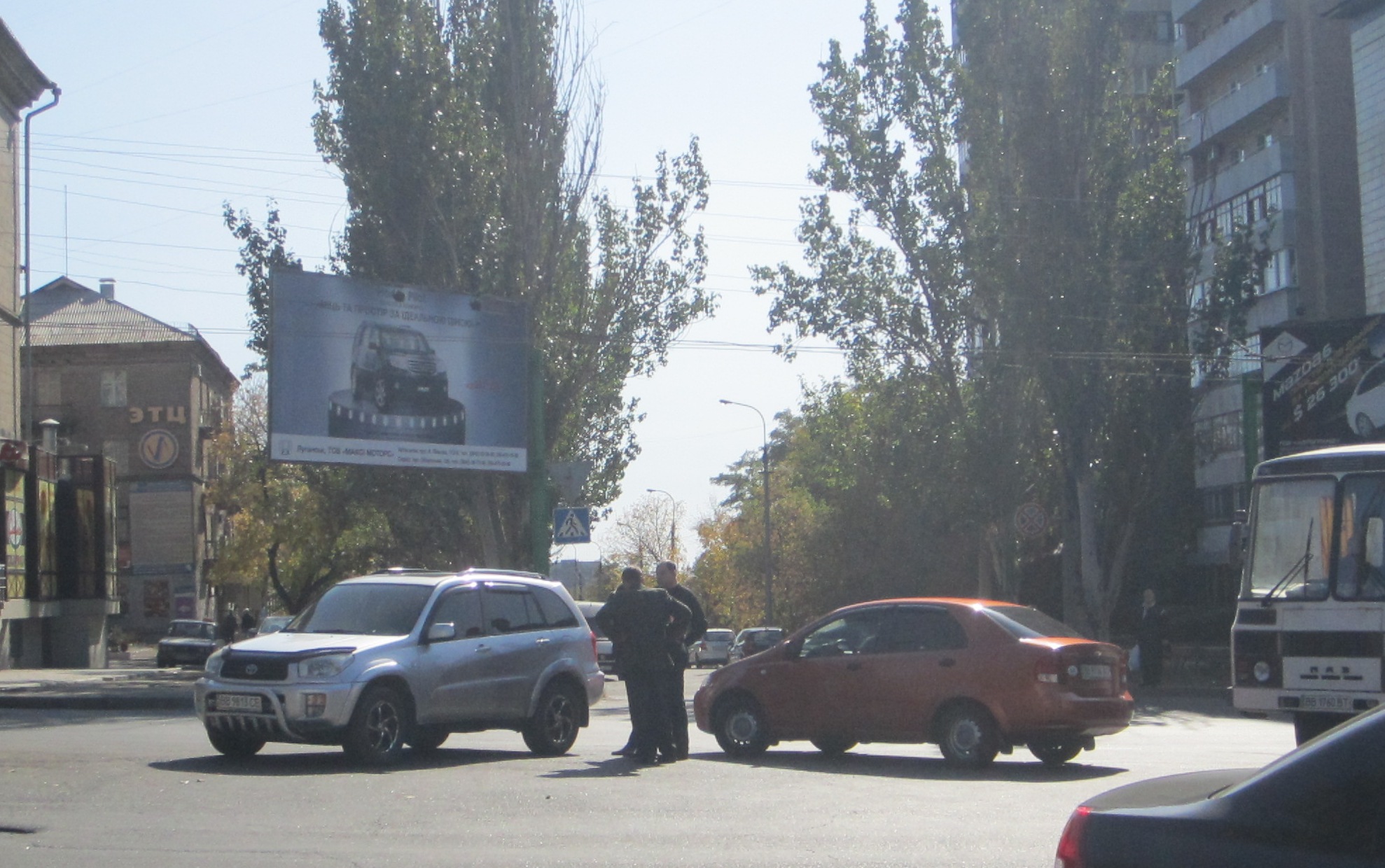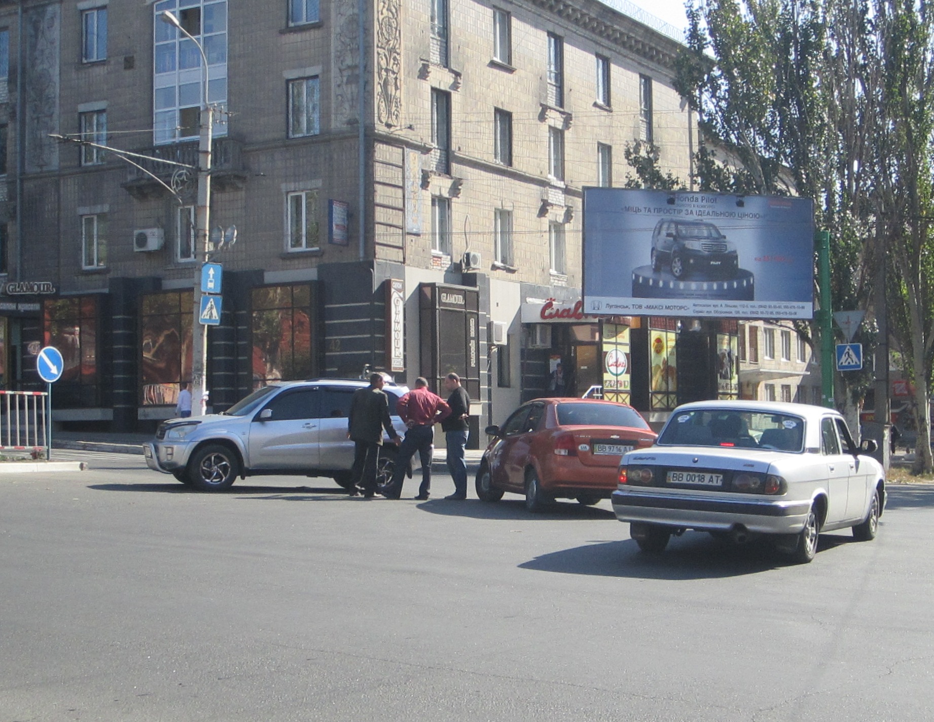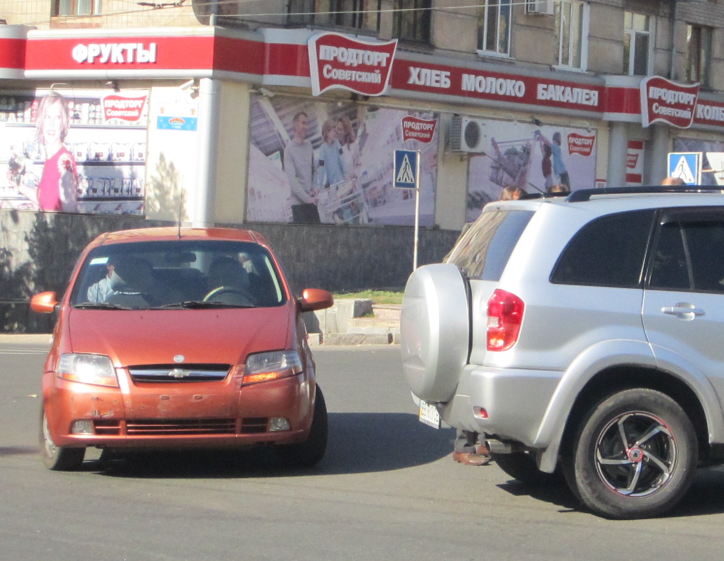 На пешеходном переходе около памятника «Труженику Луганщины», на улице Советской, не разминулись «Тойота» и «Шевроле». От столкновения у «Шевроле» отвалился передний номерной знак и повредился передний бампер. У «Тойоты» пострадало левое заднее крыло.