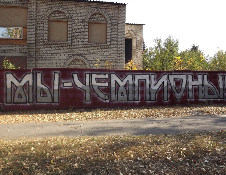 Активисты украсили забор надписью «Мы чемпионы!», портретом Германа Зонина и рисунком футбольным мяча.