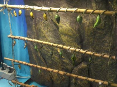 Сотрудники выставки подвешивают новые куколки в специальном месте, где поддерживается определенная температура и влажность. И прямо на выставке посетители могут наблюдать уникальный процесс превращения куколки в бабочку.