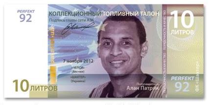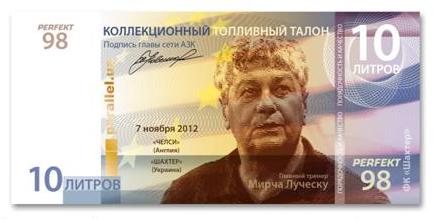 На десятилитровых талонах новой премиальной серии по традиции изображены игроки «Шахтера», участвующие в матче, а также их тренер.
