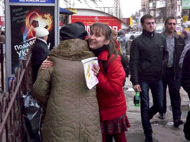 Около десятка молодых людей держали в руках плакаты с призывами «Обними меня», «Хочу обнимашки», «Раздаю хорошее настроение». Двигаясь от остановки «Динамо» к центру города, участники акции обнимали прохожих. Большинство луганчан, хоть и с удивлением, но объятия принимали.