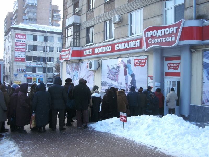 Пенсионеры Ленинского района (Луганск) выстроились в очередь возле продуктового магазина «Продторг Советский», чтобы получить свои новогодние подарки, передает корреспондент Cxid.info.