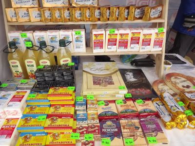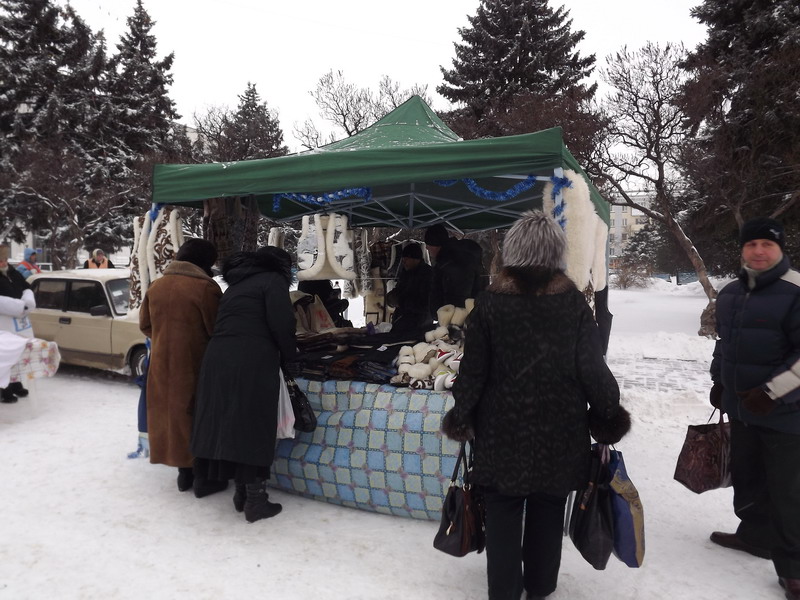 На ярмарке представлены в основном продовольственные товары: молочная продукция, мясные изделия, консервы и т.д. Однако, можно и утеплиться благодаря изделиям из натуральной овчины.