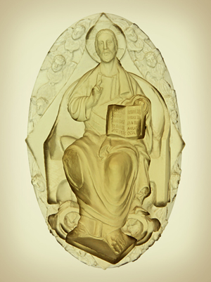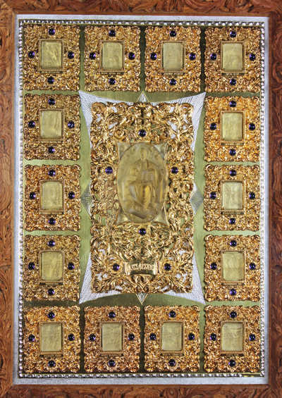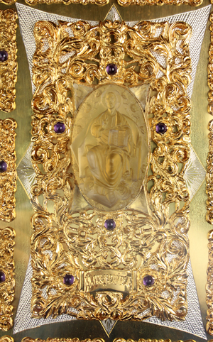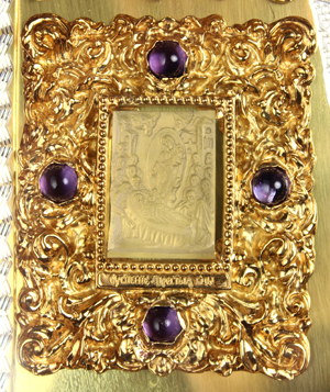 При изготовлении иконы использована уникальная техника глиптика (резьба по полудрагоценному камню).