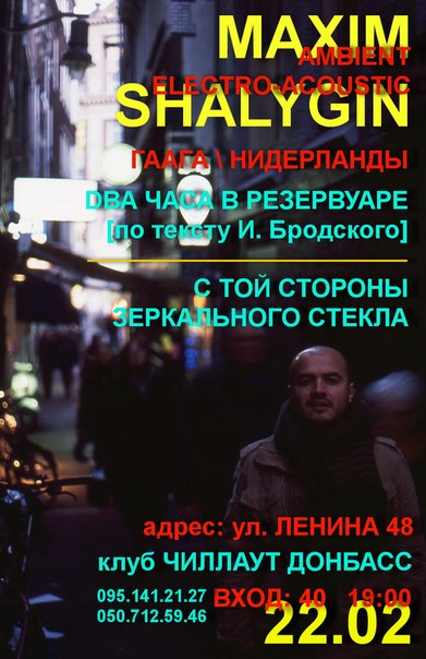 В прошедшую пятницу, 22 февраля 2013 года, в луганском чиллауте «Добасс» любители экспериментальной музыки послушали концерт композитора Максима Шалыгина, передает корреспондент Cxid.info.Это были электроакустические произведения «Два часа в резервуаре» (по одноименному тексту И. Бродского) и «С той стороны зеркального стекла». А также «Эпитафию памяти Ингмара Бергмана» для голоса, скрипки, органа и фортепиано.