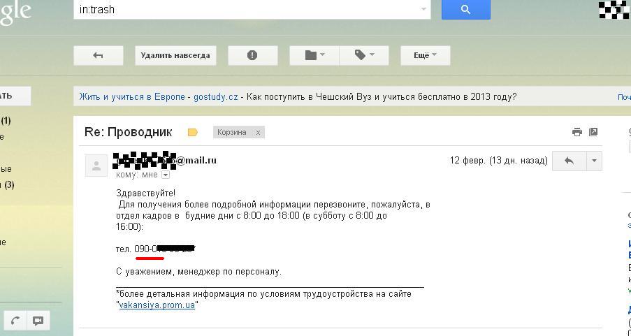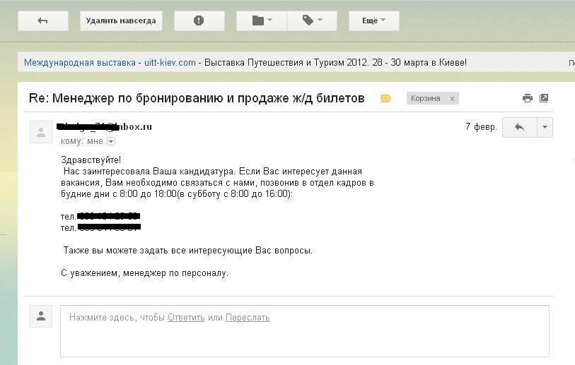 Схема, используемая во втором письме куда хитрее. Вначале мошенники сообщают вам о том, что «нас заинтересовала ваша кандидатура» и для получения более детальной информации предлагают перезвонить в отдел кадров. Вроде бы ничего настораживающего, но! Вы звоните по указанным номерам, а там слышите механический голос автоответчика, который настоятельно рекомендует вам для рассмотрения именно вашего резюме позвонить на номер начинающийся цифрами 070/090.