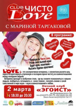 2 марта, суббота, в 18:00 в EGOIST project вечеринка «Чисто Love Club» - возможность познакомиться с новыми людьми, пообщаться, потанцевать и получить знания о науке взаимоотношений и любви. Тема встречи — «Любовь: миф или реальность?», при участии Марины Таргаковой - мастера международного образовательного проекта «Психология третьего тысячелетия». Стоимость билетов: по предварительной продаже — 50 грн. В день мероприятия — 70 грн.