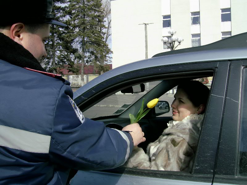В ходе этого необычного мероприятия стражи дорог намеренно и без всяких оснований с позиций ПДД останавливали автомашины, за рулем которых были представительницы прекрасного пола. Однако вместо составления административных протоколов инспекторы дорожной безопасности с улыбкой дарили цветы и теплые слова поздравления.
