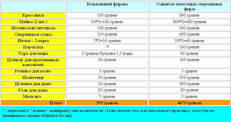 Журналисты Cxid.info подсчитали, во сколько, в среднем, обойдется «эконом» и фирменный вариант женской экипировки для похода в тренажерный зал. Результатами нашого исследования мы и делимся в следующей таблице.