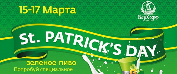 Начать празднования Дня Святого Патрика можно в пивоварне БирХофф 15, 16 и 17 марта - тематические вечеринки с зеленым пивом. Старт в 21-00. 16 марта в Шоколаде каждому пришедшему ирландский виски в подарок. Начало 19-00. И закончить в Донбассе в программе фолк-кинопоказ. Играют группы: Fjanda-faela, Pint of Stout. Начало 19 00. Вход 30грн., в костюме 20грн.