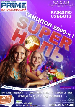 16 марта в ночном клубе SAXAR – вечеринка супер «0». Будут развлекать SAXAR SHOW GIRLS. Вход до 22-00 для девушек бесплатный. Для парней 50 грн. Старт 21-00.