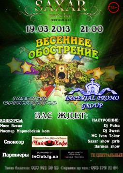 Весеннее Обострение – в ночном клубе Saxar. Вечеринка в весеннем стиле. В программе конкурсы - Мисс Весна и Мистер Мартовский кот. Выступления студенческих коллективов и Saxar show girls. Работают Dj Pulse, Dj Sweet и MC Ivan Tokar. Вход + 18, могут попросить предъявить документ. Цена 50 грн. Старт 21-00.