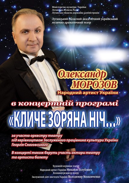 3 и 4 апреля в Луганском областном академическом украинском музыкально-драматическом театре можно увидеть концертную программу народного артиста Украины Александра Морозова «Кличе зоряна ніч…». Об этом сообщает сообщество Theater.lg.ua.