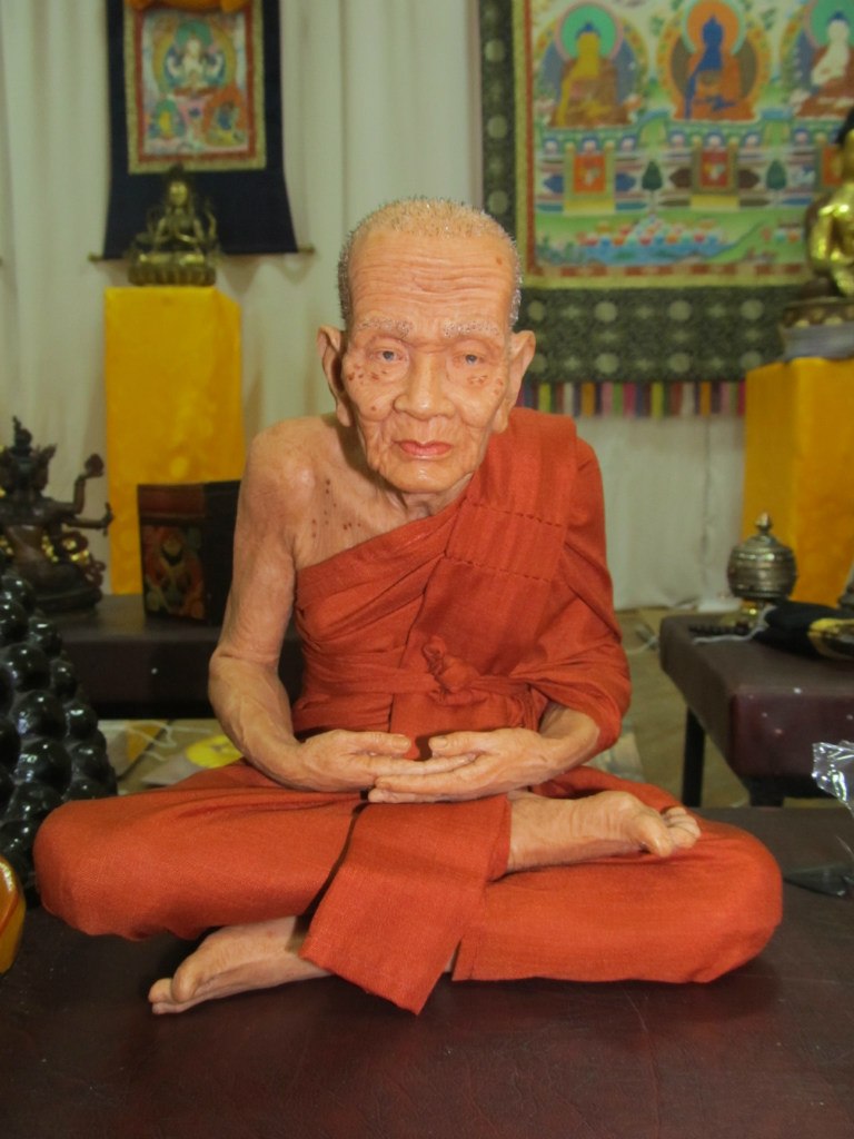 «До сих пор в Тибете, Непале и Бутане, где распространен буддизм Ваджраяны, сохранилось традиционное искусство создания металлических статуй, такое же, как тысячу лет назад, - рассказал Александр Рыбин. - Но в странах, где распространен буддизм Малой Колесницы, сейчас появился новый стиль изготовления статуй известных монахов и практиков, невероятно приближенный к натурализму. Мастера едва ли не до мельчайшей морщины на лице изучают черты мастеров Тхеравады и изготавливают их статуи из полимерных материалов. Мы привезли небольшую статую монаха, реально жившего 300 лет назад».