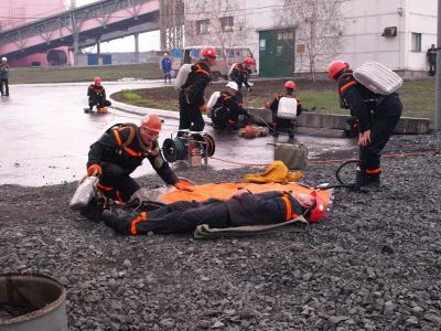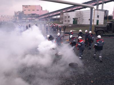 Основу программы заседания составляли противоаварийные тренировки. Сначала была смоделирована ситуация устранения пожара в административно-бытовом комплексе дробильной фабрики №3. Сотрудники, ответственные за безопасность, организовали эвакуацию посетителей и работников, оперативно обесточили здание и вызвали пожарную бригаду. Прибывшие пожарные быстро локализовали и потушили «очаг возгорания».