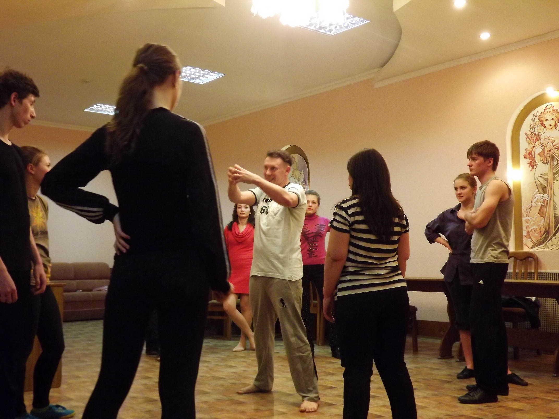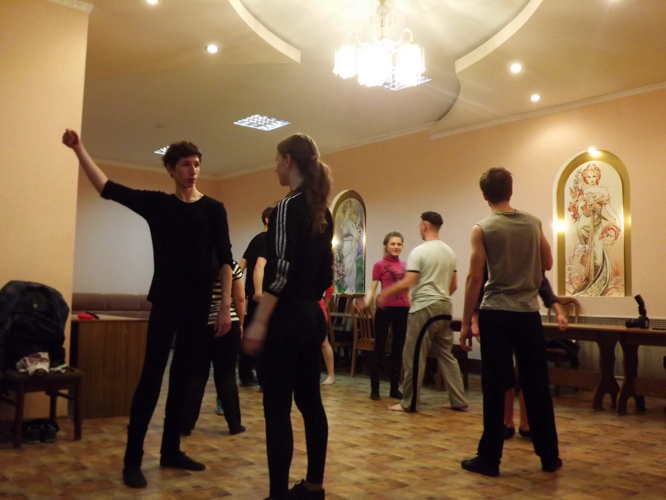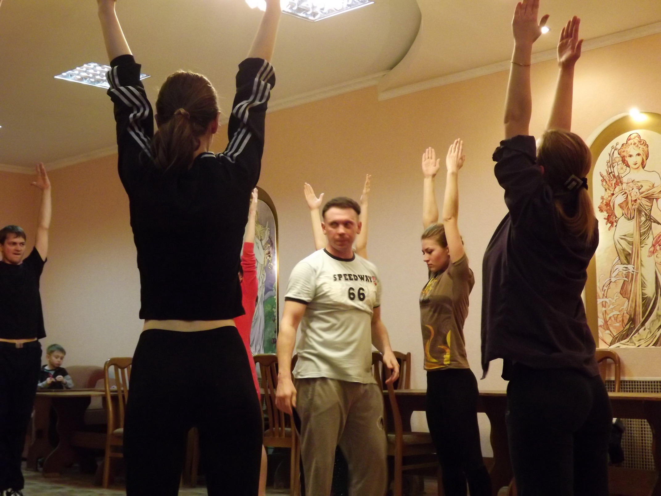 После проведения разминки и краткого инструктажа по технике безопасности он показал молодым людям простейшие приемы сценического боя, научил правильно давать пощечины, подсечки, держать ритм, расслабляться в самом неудобном положении.