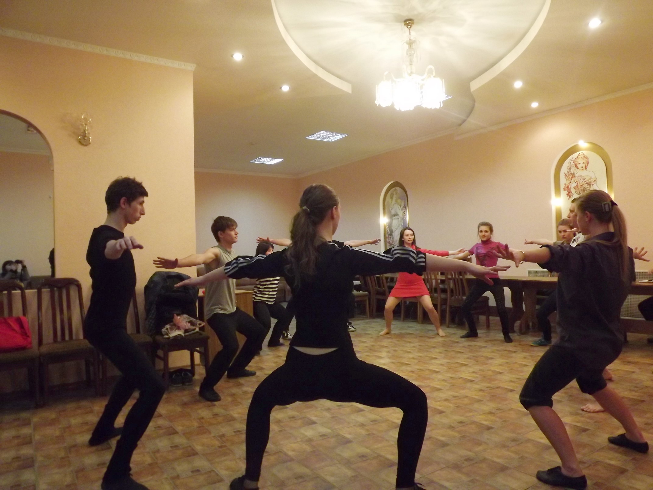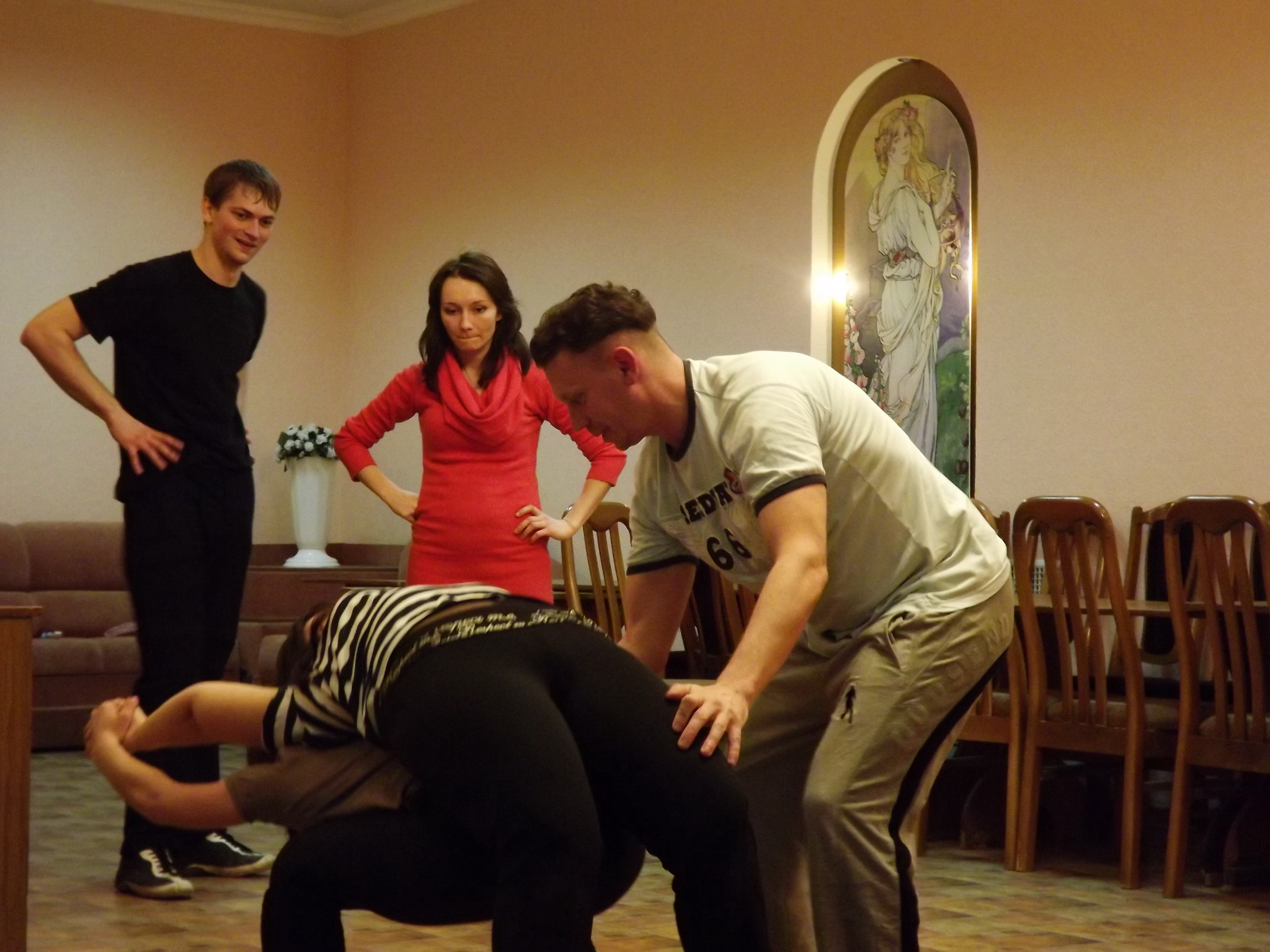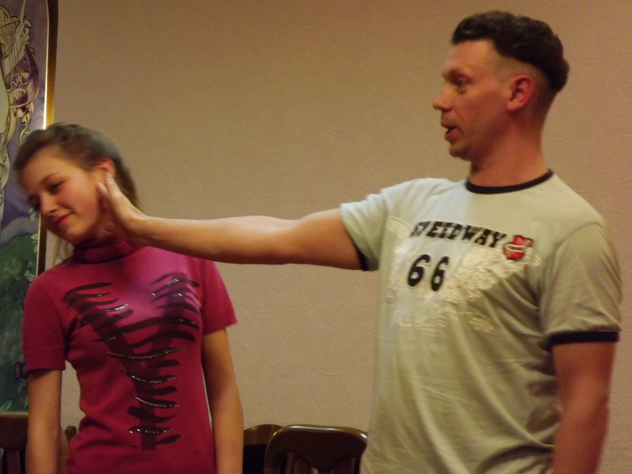 После проведения разминки и краткого инструктажа по технике безопасности он показал молодым людям простейшие приемы сценического боя, научил правильно давать пощечины, подсечки, держать ритм, расслабляться в самом неудобном положении.