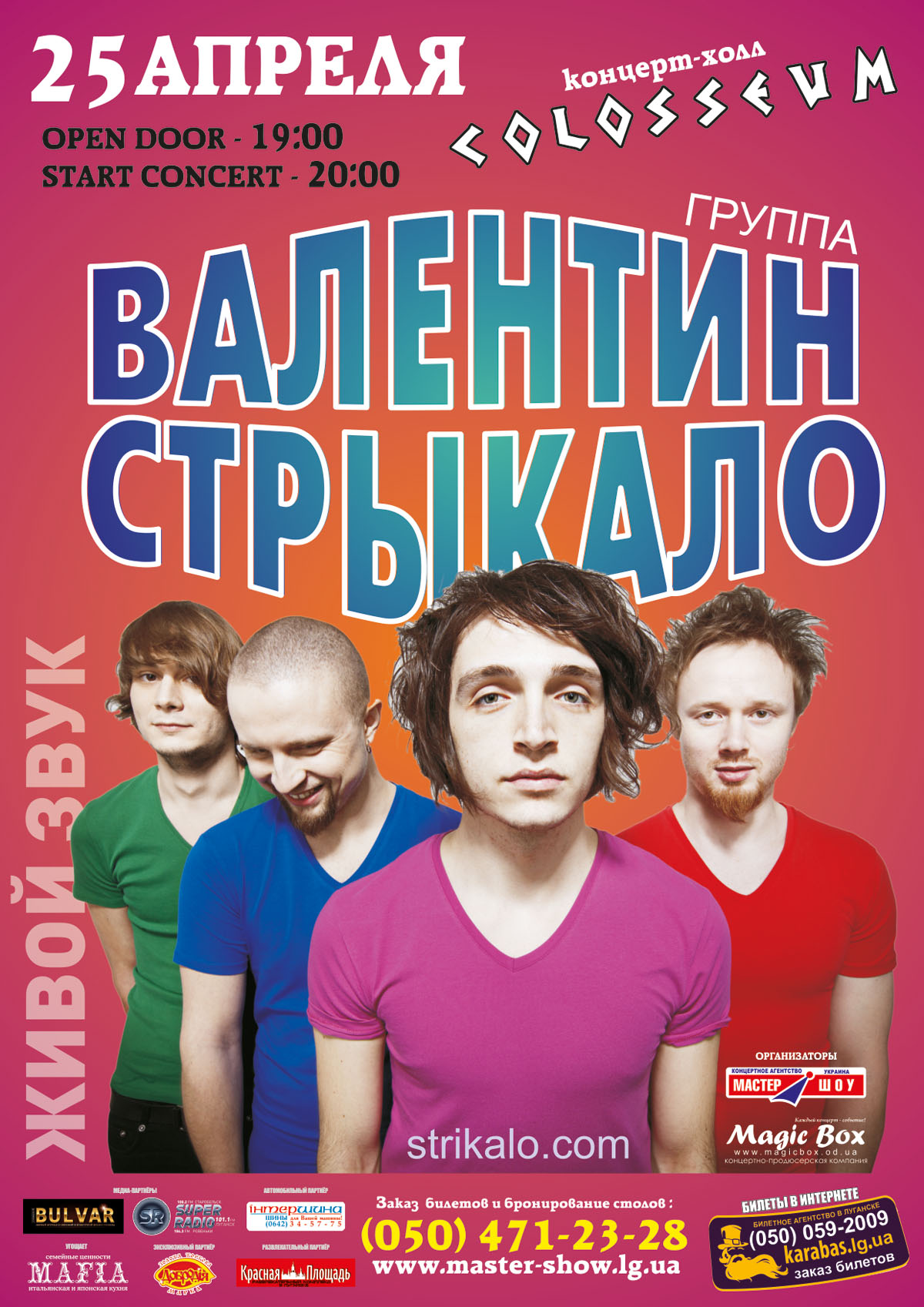25 апреля 2013 года в Луганске в концерт-холле «Colloseum» выступит популярная группа «Валентин Стрыкало». Об этом информагентству CXID.info сообщили организаторы – концертное агентство «Мастер Шоу».
