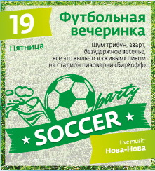 Для истинных футбольных фанатов в пивоварне Бирхофф – «Футбольная вечеринка». Гостям, пришедшим в футболке любимой команды бокал пива в подарок. Кавер-версиями известных хитов порадует группа Нова-Нова.