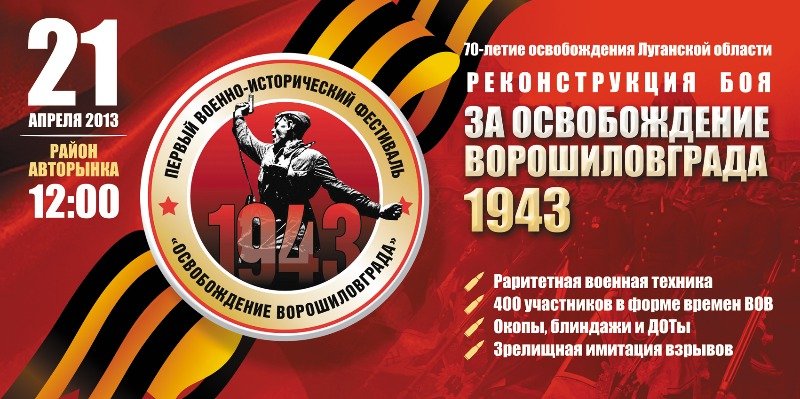Воскресенье, прежде всего, знаменательно проведением исторической реконструкции боя за освобождение Ворошиловграда. Луганчан приглашают 21 апреля на поле сражения в районе авторынка. Начало в 12:00.
