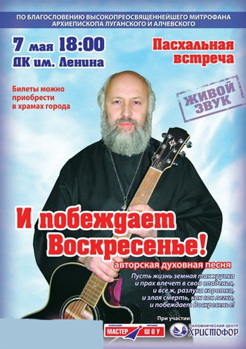 В продолжение пасхальных мероприятий в ДК им. Ленина вечер авторской духовной песни – Пасхальная встреча. Мероприятие пройдет по благословению архиепископа Луганского и Алчевского Высокопреосвященнейшего Митрофана. Организатором выступило концертное агентство Мастер-Шоу. Начало вечера 18-00. Цена билетов 35-45грн.