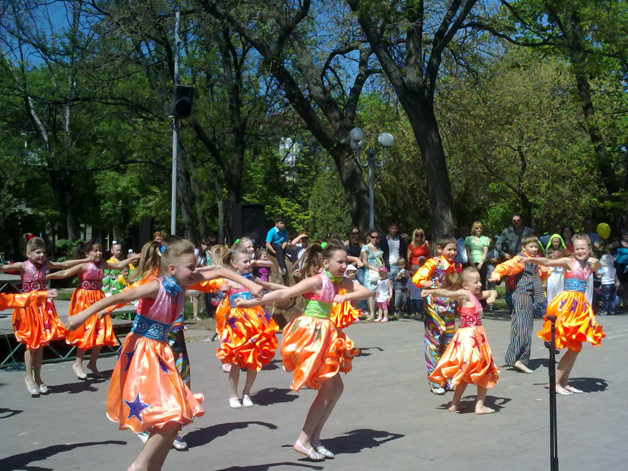 Сразу в трех местах проходят выступления детских коллективов. Маленькие артисты радуют зрителей зажигательными танцами.
