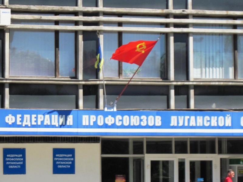 На некоторых зданиях рядом с национальным флагом Украины развевается знамя Победы.