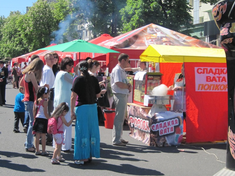 На Театральной площади традиционно предлагают сладости и развлечения для детей. Возле русского драмтеатра готовят сцену для вечернего концерта.
