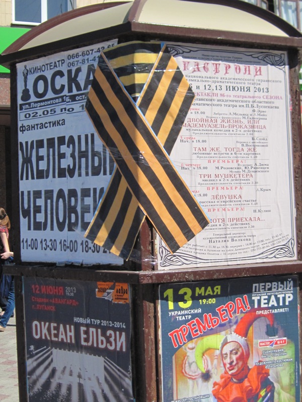 Георгиевские ленты можно увидеть и на тумбах с афишами.