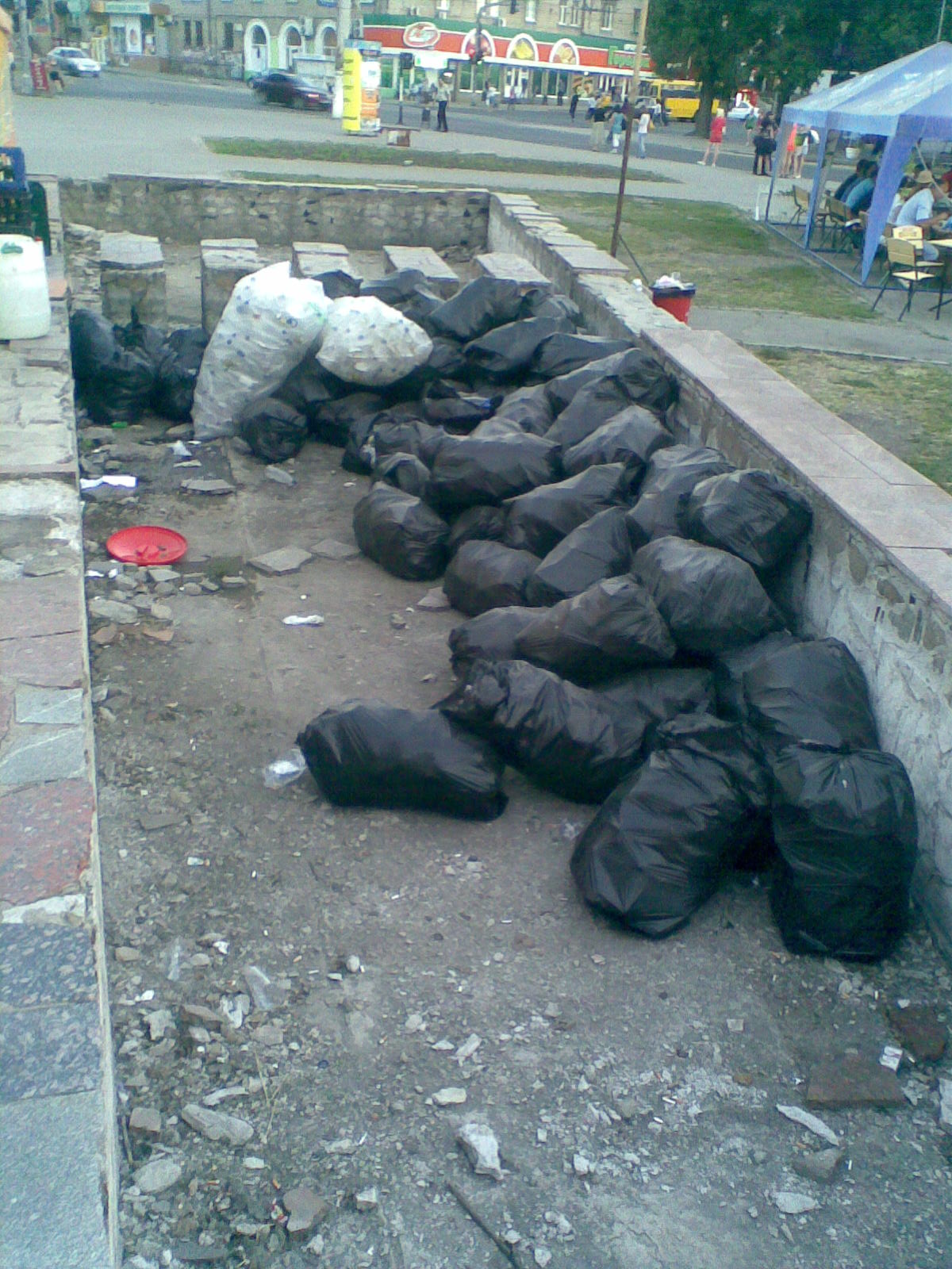 На фото видно, что в чаше фонтана, рядом с летним кафе, находятся десятки пакетов с мусором.