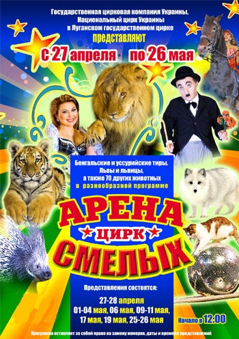 Воскресенье 19 мая время для семейного отдыха. В Луганском цирке Государственная цирковая компания Украины совместно с Национальным цирком Украины презентует новую программу «Арена смелых». Программа подарит зрителям незабываемые эквилибристические, акробатические и юмористические номера. Начало представления 12-00. Цена билетов 80-150грн.