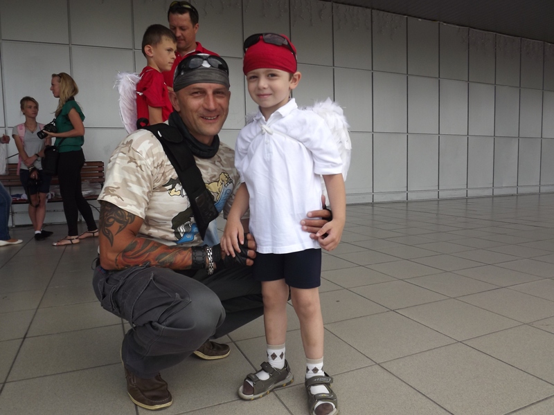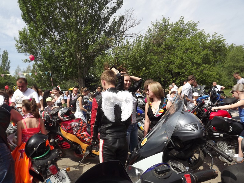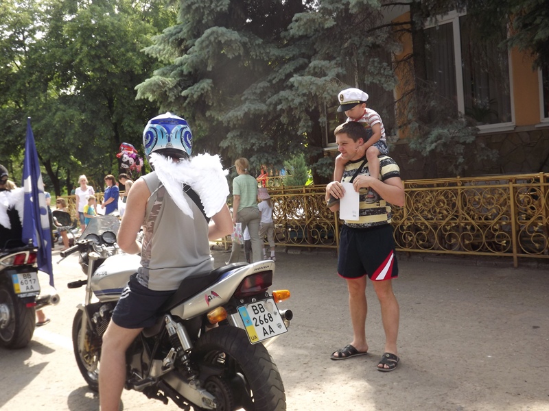 Подготовка к поздравлению началась еще возле супермаркета «Лелека» на улице Буденного – там с самого утра начали собираться мотоциклисты. Всем подъезжающим выдавались крылья ангелов, ведь акцию устраивала благотворительная организация «Фонд Ангелы».