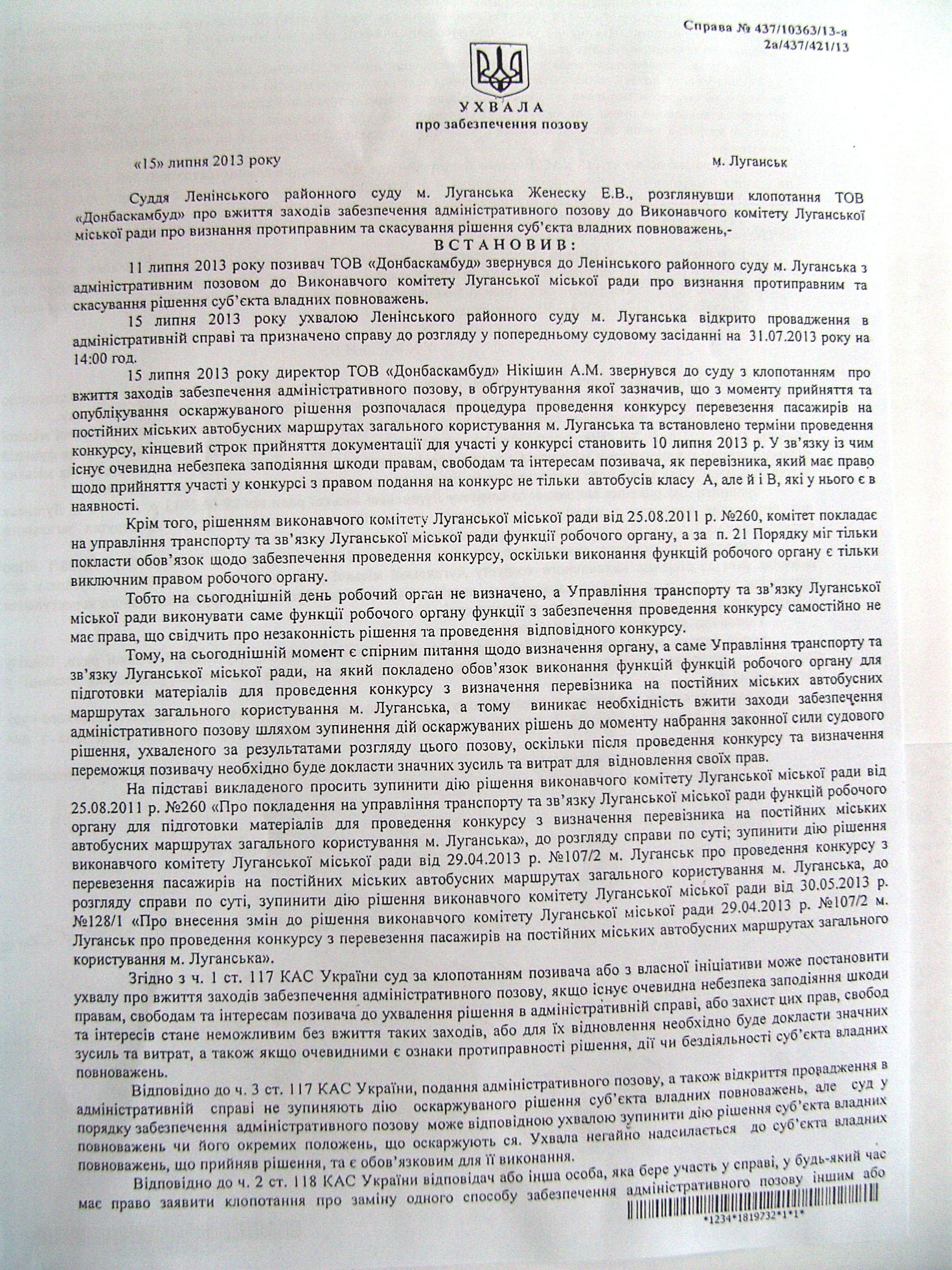 Так, руководство предприятия «Донбасскамбуд» подало административный иск на действия исполкома Луганского городского совета по поводу его решений, касающихся вопросов пассажироперевозок.