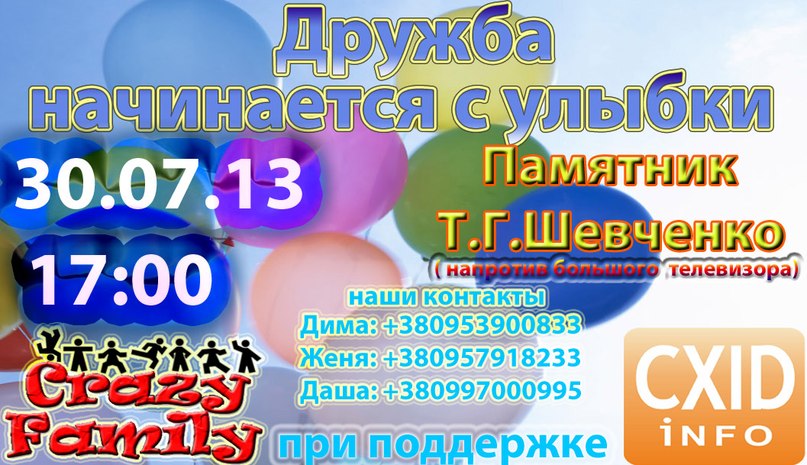 В знакомой всем с детства песенке есть замечательные слова: «С голубого ручейка, начинается река, ну а дружба начинается с улыбки». В Международный день дружбы, 30 июля, ребята из «Crazy Family» при поддержке информационного агентства CXID.info решили провести акцию «Дружба начинается с улыбки», которая способна подарить радость всем без исключения луганчанам.