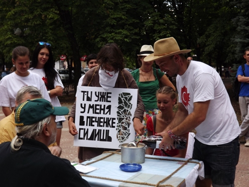 Сегодня, 29 июля, ко Всемирному дню борьбы с гепатитом, под стенами Луганского областного совета прошла акция-выставка социально-художественных работ «Желтая книга Луганщины», а так же перформанс «Гепатит-фуршет», передает корреспондент CXID.info.