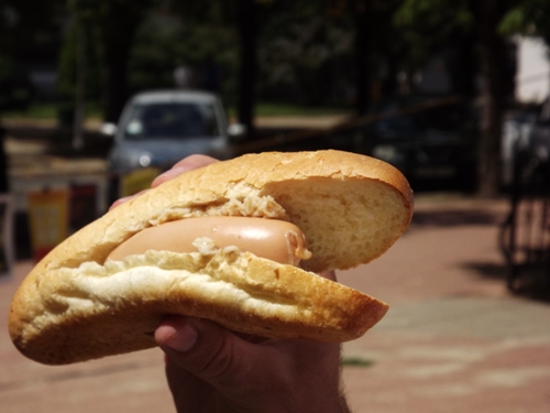 Потом всем раздаются булочки для хот-дога и вареные сосиски
