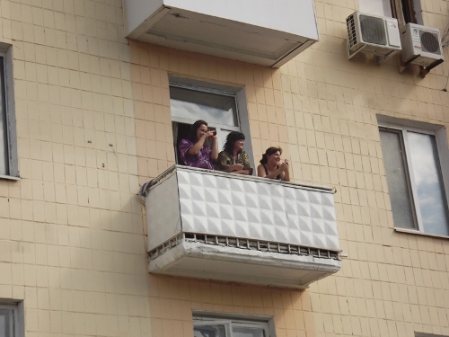 Люди выглядывали с балконов и приветствовали шествующих десантников