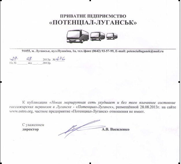 К публикации «Новая маршрутная сеть ухудшает и без того плачевное состояние пассажирских перевозок в Луганске, - «Потенциал-Луганск», размещённой 28 августа 2013 года на сайте ostro.org, частное предприятие «Потенциал-Луганск» отношения не имеет.