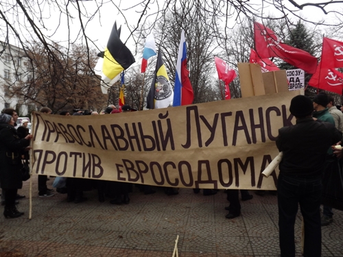 Напомним, вчера, 26 ноября, в Луганске, несмотря на запрет Луганского окружного административного суда, митинговали представители партии «Батьківщина» и ВО «Свобода» за подписание Украиной Соглашения об ассоциации с ЕС.