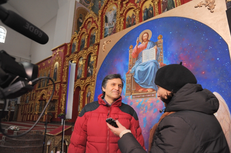 «Действительно, это не первая икона, но что касается полотна такого масштаба – это уникальный опыт для меня. Хотя я писал большие полотна, у меня есть несколько крупных панно, я создавал настенное панно размером четыре на десять метров, поэтому у меня опыт в этом есть. Но что касается иконы – это другое духовное настроение, другие мысли, поэтому и наполнение было другим. Сегодняшний день – особый для меня. Переполняет чувство радости и благодарности – моим друзьям, близким, которые мне помогали, чтобы это случилось. Есть такое выражение: вера без дел мертва. Я художник, и вот это – мое дело. И я надеюсь, что то, что я сделал, говорит само за себя. И еще хочется сказать классическое: Слава Богу! Потому что все, что происходило и происходит сегодня, было бы невозможно без Господнего участия. Слава Богу!»