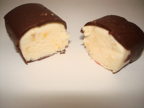 10. Внешние характеристики и аромат: глазурь полностью покрывает поверхность сырка. Заливка ровная, однородного цвета, но шоколад чересчур ломкий. Внутри обычная сырная масса с мелкими крошками наполнителя. В аромате кисломолочного запаха творога совсем не ощущается. Зато остро выражены шоколадные нотки (видимо, не зря в составе указан ароматизатор «Шоколад»)