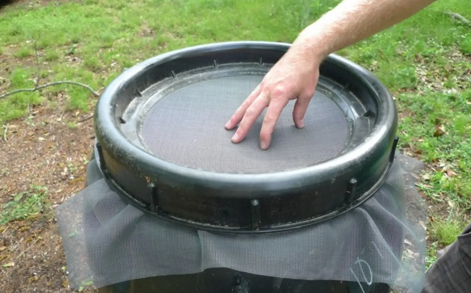 Первое, что потребуется сделать — отрезать кругом внутреннюю часть крышки бочки, оставив только контур. Накрыть верхушку бочки сеткой и закрыть «колечком» крышки. Это — защита от мусора и комаров.
