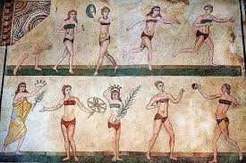 Хотя история моды свидетельствует, что ещё 1600 лет тому назад в Римской империи женщины носили купальные костюмы, состоящие из двух деталей. Они запечатлены на римской мозаике 4 века, открытой археологами при раскопках виллы Казале на Сицилии.