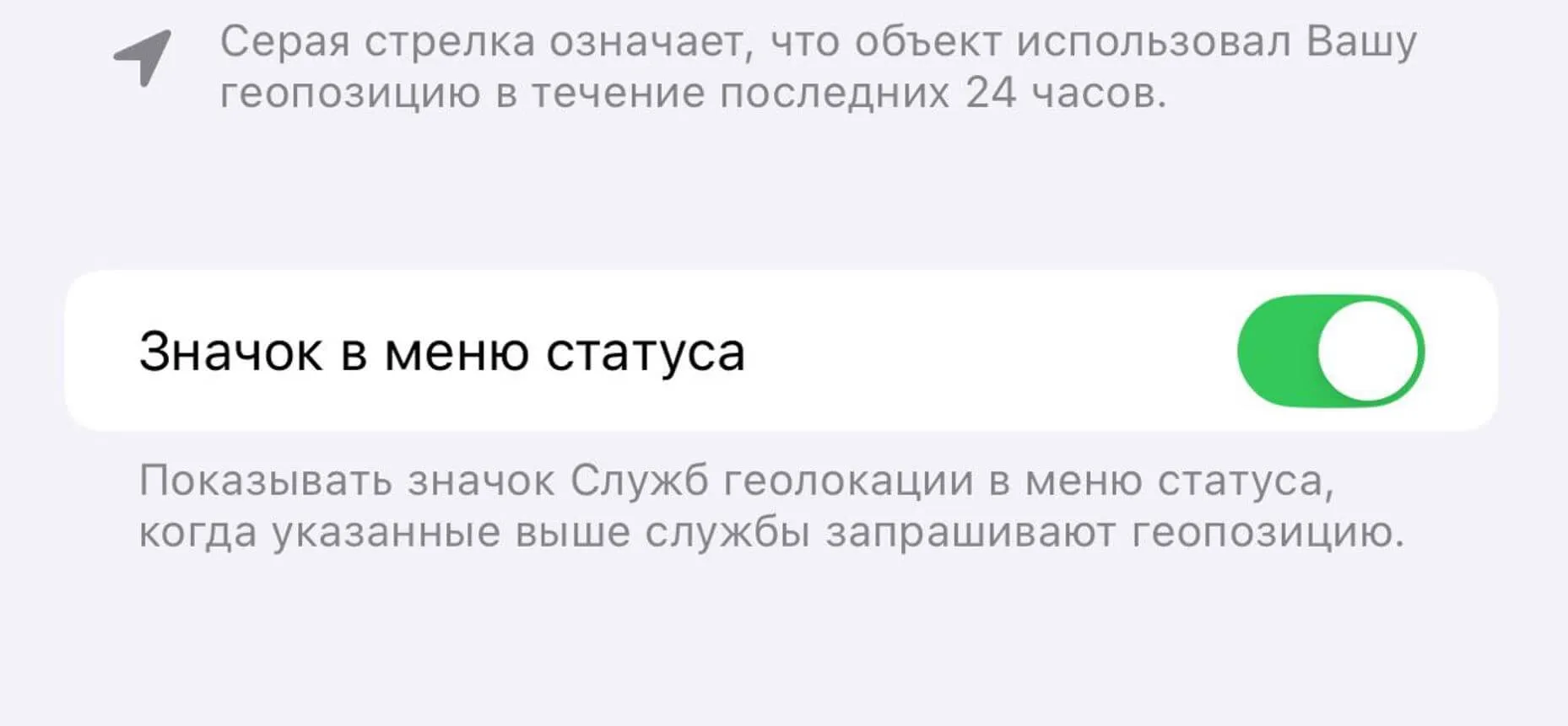При выборе настройки «Только при использовании приложения» стрелка исчезает сразу после завершения сессии. Если же вы установили параметр «Всегда» или «При использовании приложения или виджетов», иконка может появляться и вне активности самого приложения.