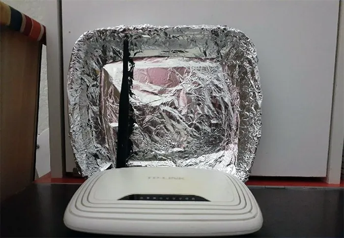 Звучит странно, но если роутер старый или нужно увеличить сигнал простыми средствами, можно попробовать этот метод — особенно если устройство стоит возле внешней стены. Лист фольги следует разместить так, чтобы сигнал отражался в нужном направлении.