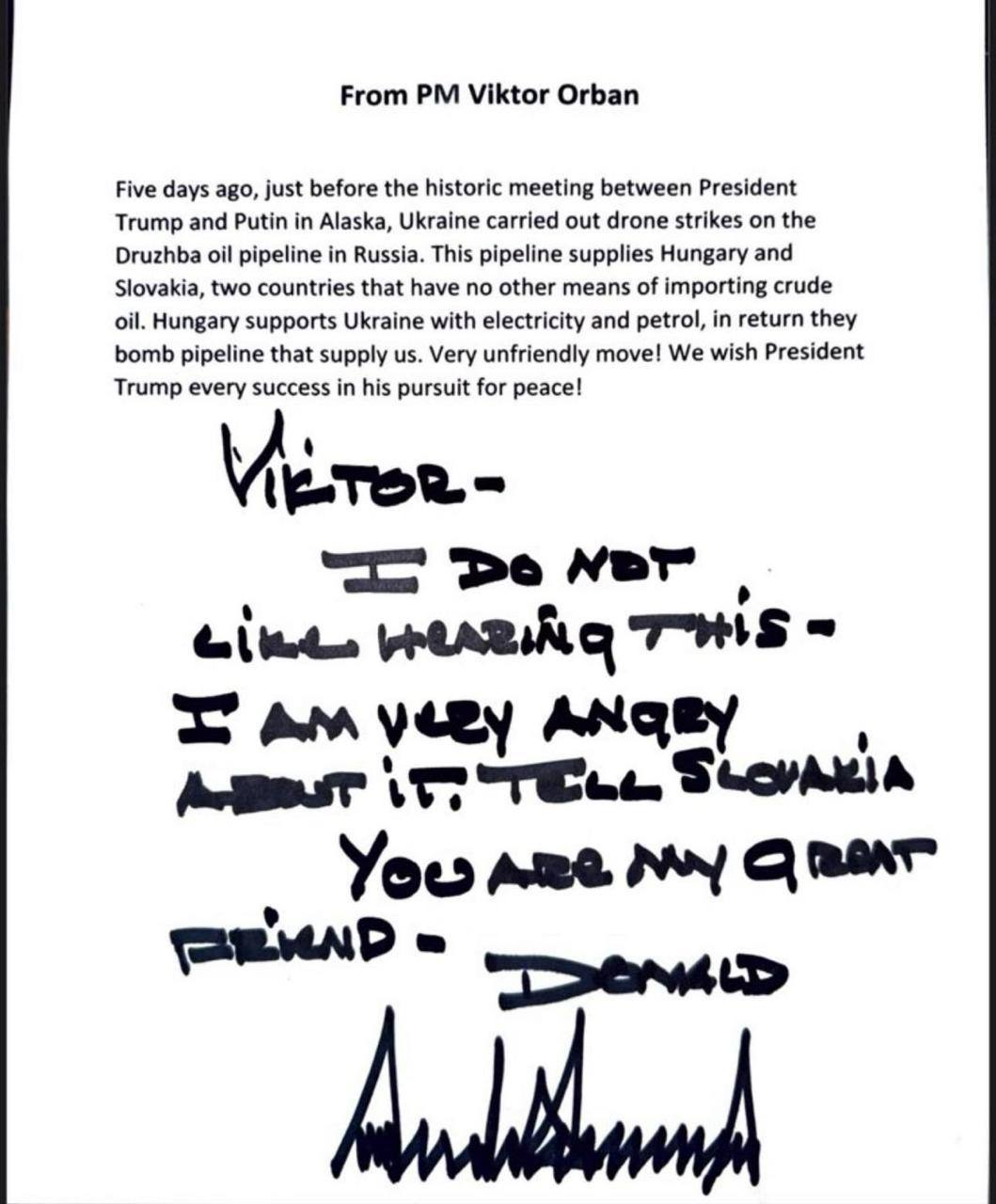 По данным источников, Трамп в письме заявил Орбану, что «очень зол» из-за ударов Вооружённых сил Украины по объектам нефтепровода «Дружба».