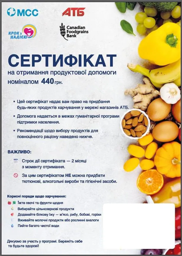 Номинал ваучера составляет 440 гривен. Использовать его можно в сети супермаркетов АТБ — это позволяет самостоятельно выбрать продукты с учётом собственных вкусов, привычек и диетических ограничений. Такой формат делает помощь не только полезной, но и сохраняет уважение к каждому получателю.