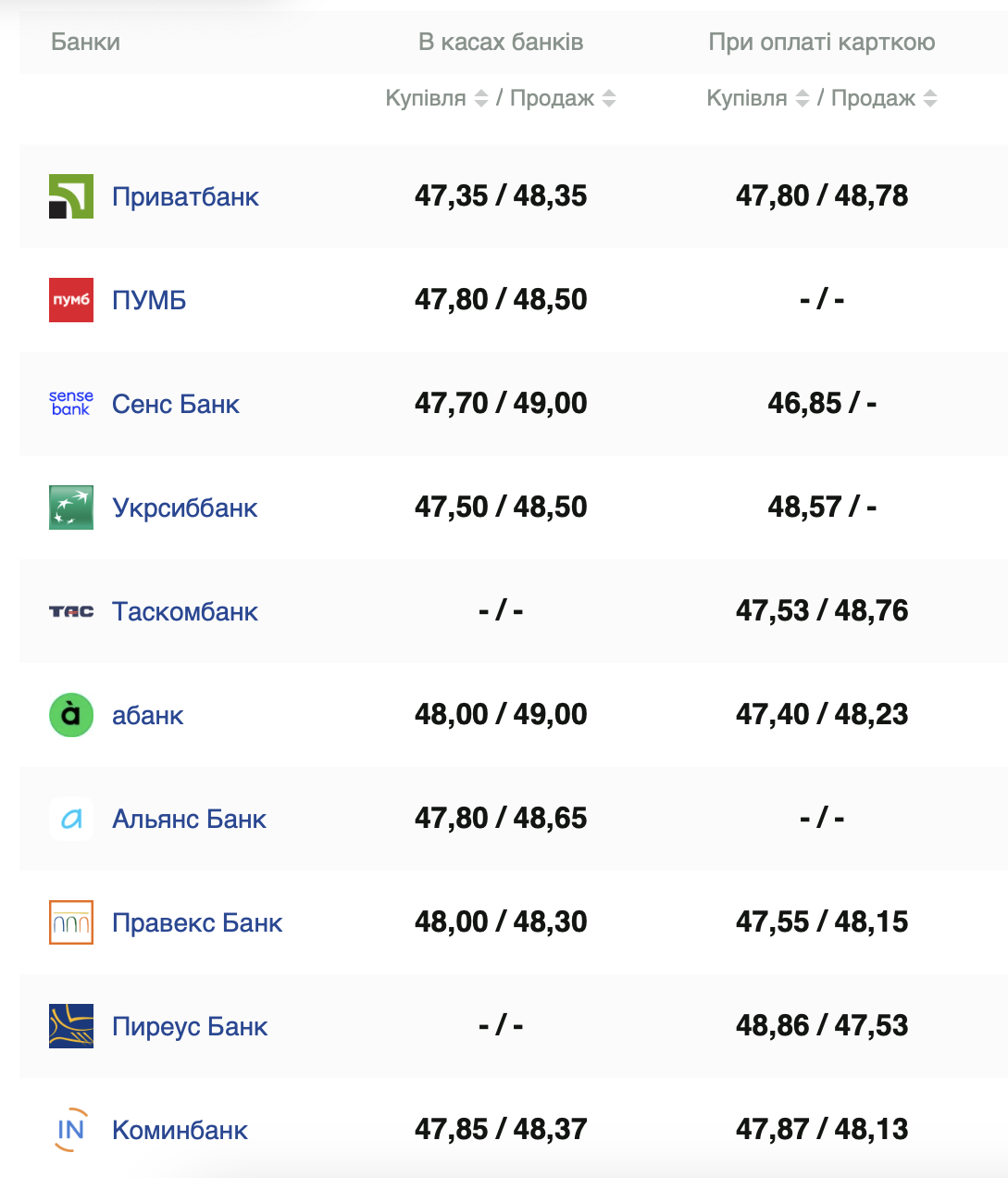 При оплате картой ПриватБанк удерживает одни из самых выгодных ставок — 47,80 при покупке и 48,78 при продаже.